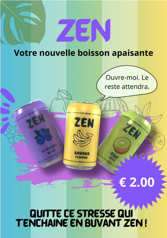 Ce site présente le projet ZEN, réalisé dans le cadre du cours de marketing. L’objectif était de créer une marque fictive complète : du concept du produit jusqu’à sa communication visuelle et publicitaire.
